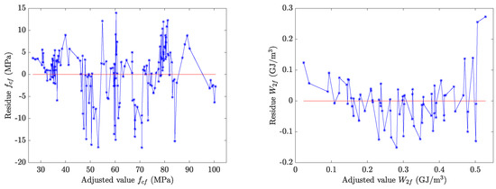 Residues of the compressive strength (, left) and the volumetric deformation work in the post-peak branch (, right).