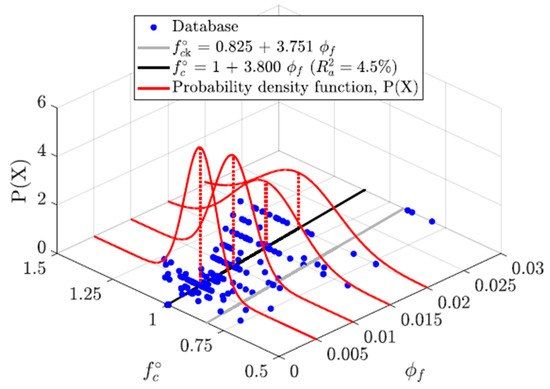 Insofar as , the SFRC compression strength, it was only significantly affected by , thereby demonstrating a slight increase as fiber was added. Despite the low value of (5.3%), the statistical significance, demonstrated by , and the positive value of its adjustment coefficient in the model indicated the tendency of the increase of , in mean values. This is how this effect must be interpreted, as observed in Figure 10. The value of may be easily measured through the uniaxial strength test [67] or calculated by means of Equation (10), which was obtained from a new linear correlation between and alone: