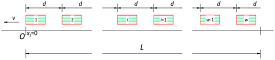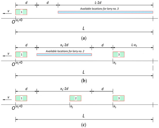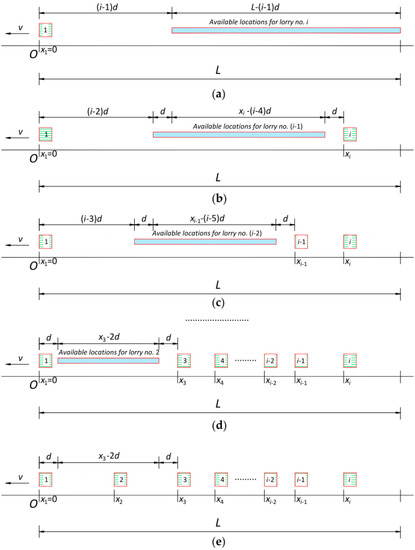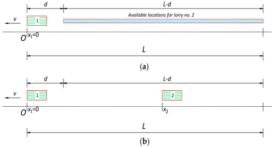 Since the distance between two consecutive lorries cannot obviously be nil, the waiting time for the -th vehicle in the queue depends on the maximum extent of the part of the reference length where the -th vehicle can be located, provided that all the preceding vehicles are on . With this premise, as illustrated in Figure 2, is given by: