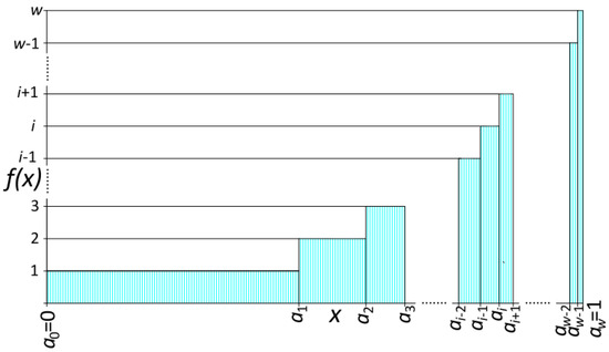 Figure 3. Step function (Equation (20)). - Assign a suitable probability distribution function (pdf) describing the position of the vehicle in a given interval: For example, referring to this aspect, adoption of an uniform pdf could be a simple and somewhat natural choice, but there are no restrictions.