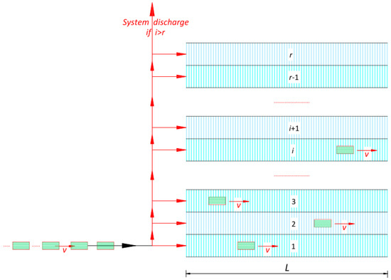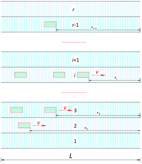 Clearly, said the minimum distance between the first axles of two consecutive vehicles, the situation corresponding to exactly vehicles traveling simultaneously on one lane is that outlined in Figure 1, being the -th vehicle outside the length .