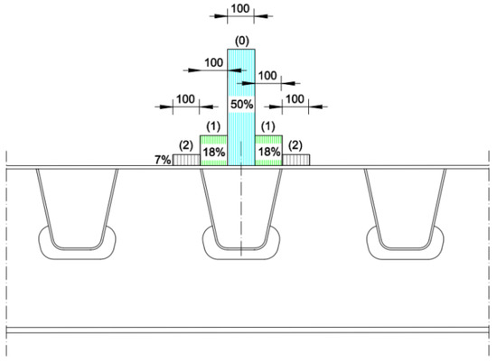 The fatigue damage has been thus evaluated adopting the Palmgren–Miner rule [44,45] and considering single slope curves with , as usual for structural steel details subject to high number of stress cycles. Finally, the corresponding values of have been calculated by means of Equation (56), comparing the fatigue damage caused by the two-lane traffic with the fatigue damage caused by the first-lane traffic.