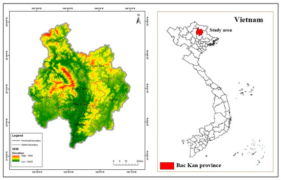 The study area is Bac Kan province, Vietnam. It is situated in the northeastern part of the country and lies between 21°48′N to 22°44′N and 105°26′E to 106°15′E. It covers an area of 4859.4 km2, and its elevation varies between 30 and 1600 m above mean sea level (Figure 1). Nature gives the Bac Kan province numerous mountains, rivers, and lakes that are very scenic and have become well-known sights, such as Ba Be Lake, Puong Cave, Dau Dang Waterfall. In addition, it is a center of plentiful primitive forest resources with the fullness of flora and fauna. In 2011, Ba Be National Park located inside Bac Kan had Ramsar site recognized as No. 1938 in the world [44]. In addition, it is known as a center of mineral resources (lead, zinc, iron, and gold) formed by different geological processes and activities from the Cambrian era through the Quaternary period [45]. Moreover, with seven ethnic groups living together, Bac Kan has a vibrant and diverse culture with a variety of unique customs and habits. The integration of natural resources and social characteristics has formed a richness in the mixture of the Bac Kan landscape.