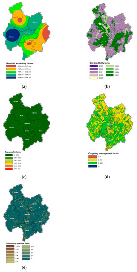 Figure 3. Spatial distribution of USLE factor maps: (a) rainfall erosivity factor (R), (b) soil erodibility factor (K), (c) topographic factor (LS), (d) cropping management factor (C), and (e) supporting practice factor (P).