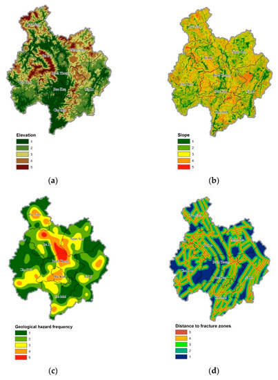 Ecological elements create the ecological structural resistance included (1) elevation, (2) slope, (3) geological hazard frequency, and (4) distance to fracture zones. The weight of each element was determined using the analytical hierarchy process (AHP) from 10 experts. This method is useful for obtaining a single assessment value based on different indicators or criteria [63]. Herein, the standard numeric scale used for the AHP is on a 1–9 scale that lies between “equal importance” to “extreme importance”, the value 1 indicates equal importance, while value 9 indicates that one indicator is extremely important than others [64]. To implement the AHP, the Super Decisions software (version, Manufacturer, City, US State abbrev. if applicable, Country) was used to calculate the weight and the inconsistency index. If the inconsistency index is less than 0.10, no correction of judgments is needed [65].