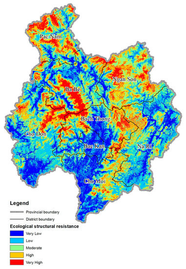 To prepare ecological elements for ecological structural assessment, elevation and slope were first extracted from DEM and then reclassified into 5 classes using the natural breaks method. By using the natural breaks method, similar values are grouped and therefore the differences between classes are maximized [66]. The resistance level has a positive relationship with elevation and slope classification. Meanwhile, the spatial characteristics of the geological hazard frequency, which was represented by historical landslides and flash flood records of Hung [67], was first extracted using the kernel method for surface interpolation under ESRI ArcMap software and reclassified into 5 classes using the natural breaks method. The resistance level of this indicator has a positive relationship with its classification. In the meantime, the distance to fracture zones, which are in crustal strata along where adjacent rocks have been displaced, was extracted based on a Bac Kan geological map using the Euclidean distance method under ESRI ArcMap software (version, Manufacturer, City, US State abbrev. if applicable, Country) and reclassified into 5 zones (0–200 m, 200–500 m, 500–1000 m, 1000–2000 m, and greater than 2000 m). The resistance level of this indicator has a negative relationship with its classifications.
