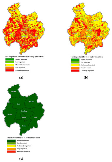 The ecological functional resistance is described by different ecological processes, as well as the relationship between human demands and the natural ecosystem [69]. The ecological functional resistance for construction and development that was assessed through ecological importance included (1) biodiversity protection, (2) water retention, and (3) soil conservation.
