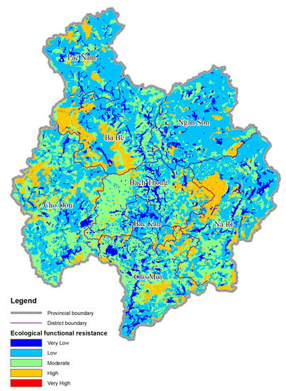 In this study, the important ecological function area in Bac Kan province that includes Ba Be National Park, Kim Hy Natural Reserve, and Nam Xuan Lac Species and Habitat Conservation Area from Bac Kan Department of Natural Resources and Environment in 2017 were first chosen to create distance surface data using the Euclidean distance method under ESRI ArcMap software (Manufacturer, City, US State abbrev. if applicable, Country), and it was then classified into 5 levels using the natural breaks method. The dynamic resistance level caused by this indicator has a positive relationship with its classification.
