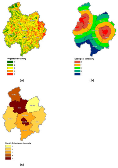 (a) Vegetation stability (S1). Vegetation stability shows the vegetation capacity to resist interfering and sustain its condition with environmental variations [14]. In this study, vegetation stability was quantified through the variation amplitude of vegetation using the normalized difference vegetation index (NDVI) from MODIS product (MOD13Q1) with support of the TIMESAT 3.3 software (Manufacturer, City, US State abbrev. if applicable, Country). Actually, vegetation stability is the reciprocal of variation amplitude of vegetation. The lower the variation amplitude, the greater the vegetation stability, and therefore the higher the resistance to development activities [14]. In practice, the NDVI dataset of 207 scenes (23 scenes/year) between 2009 and 2018 was used to quantify the variation amplitude of vegetation. The quality of vegetation data was here used to assign the weight for adjusting the NDVI dataset based on the pixel reliability index (Table 10).