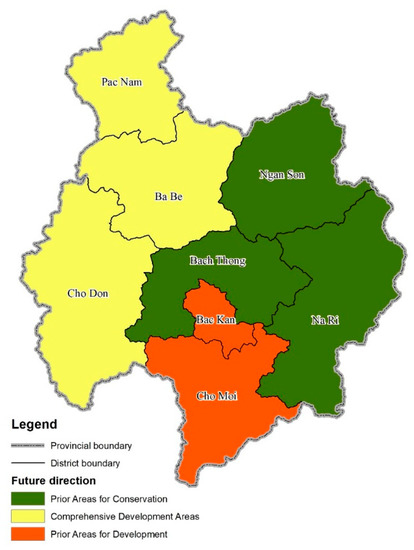 Bac Kan province was chosen as a case study to balance land utilization for economic development and conservation. Bac Kan is a mountainous province located in the hinterland of the northeastern part of Vietnam, but it has a significant position in terms of economic and national security, particularly tourism and mineral resources. In addition, it has been developed by the industrialization and urbanization process [34]. However, there are more and more houses that have been illegally constructed in unsuitable areas due to urbanization and tourism activities [35,36,37]. At the same time, environmental problems (water pollution) and natural disasters (landslide and land degradation) have been dramatically increasing in the last decade, and they threaten the health and property of citizens [38]. These issues had been mentioned by many researchers. Ha [39] stated that if a landslide occurred over an area of 1000 m2 in Bac Kan’s capital city, there might be a risk of life loss of 1.7 persons and asset loss would be approximately 65,000 USD per household. Additionally, BKPC [40] and Vu [41] reported about land degradation due to soil erosion and landslide on the steep hills and mountains. Giang [38], Ha [42], and Them [43] also mentioned about water pollution in the area. To some extent, these studies do not provide any suggestions on how to mitigate these existing problems, although the provincial authorities are increasingly becoming aware of these problems. Therefore, the sustainable use of natural resources for development and conservation in Bac Kan is very important and challenging.