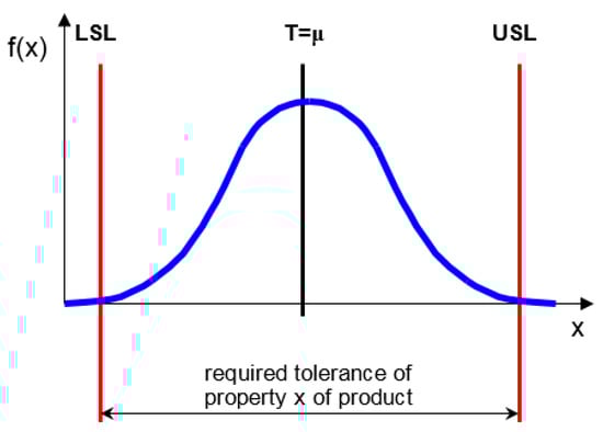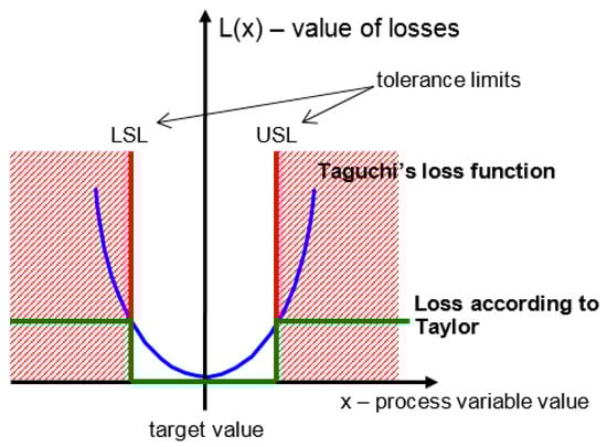 The assessment of the quality of production processes is associated with the assumption that each product delivered to the customer is endowed with a defect (loss); the smaller it is, the higher is the quality of the product [31,32]. This loss is the higher the more the value of the product feature considered deviates from the target value, including within the tolerance range. This contradicts the view expressed by Taylor that the product quality is constant if the property under consideration falls within the tolerance range (Figure 1). The tolerance field is defined here by the lower LSL and upper USL tolerance limits.