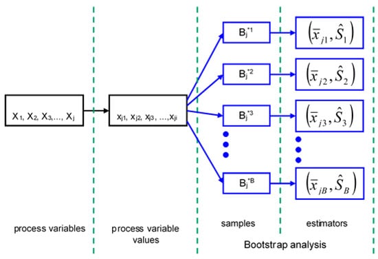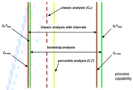 There are methods that simplify the procedure when assessing process capability using numerical indicators. One of such methods is bootstrap analysis based on the so-called bootstrap samples [44], which can be used when the sample size is not very large (show Figure 3). The purpose of this analysis is the possible verification of previously obtained results using factor methods.