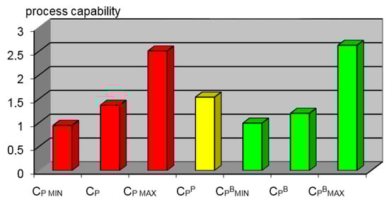 The principle of process capability assessment should be to take into account confidence intervals with a lower limit CP MIN. This indicates that with some probability (the confidence interval was calculated at P = 95% in the work), the capacity of the analyzed process will not be lower than the lower limit of the confidence interval [58,59].
