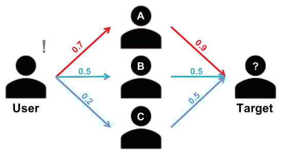 Indirect Trust (ITR): When it comes to a situation where a customer has no information (prior transaction) with a seller, the customer faces the following problem; “I do not know her. How can I trust her?” Although the customer can check the seller’s reputation, it may not be enough for her to make a decision if the reputation is below her expectation. In this case, shows off its ability. To calculate the from A to B, our model determines a broker X who has the highest product () among others who have done transactions with both A and B. Once the broker is determined, is derived according to Equation (9). Figure 3 illustrates an example of calculation between the “user” and the “target”, given that there is no direct trust (past transaction) between the two. In this example, user A will be selected as the broker to calculate the . If new becomes available between the two entities, previously derived is replaced by the newly generated .
