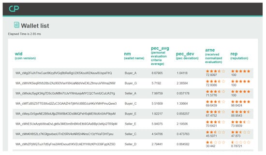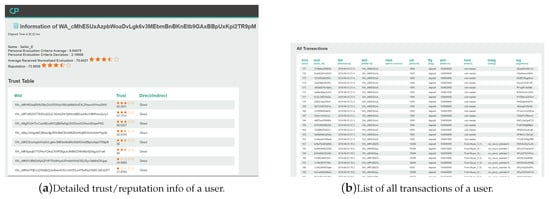 Once we have the transaction and rating information in the blockchain, trust and reputation can be calculated simply by parsing those information in the blockchain and applying our model in Section 3.1, Section 3.2 and Section 3.3. For example, Figure 4 shows the web interface screenshot for the list of all wallets and their respective reputation/trust model values in our prototype escrow system based on blockchain. Furthermore, Figure 5a is the web screenshot for the detailed trust/reputation information of an user, and Figure 5b lists all transaction history of that user. We have built our model into a real blockchain-based prototype system for online transactions (including escrow service and money transfer), and this system is now evolving into a new blockchain-based platform (http://nodehome.io) that is preparing to launch soon as a commercial service.