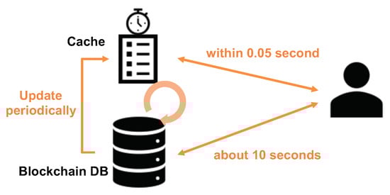 If any inconsistency is found between the cache and the blockchain data, new information derived from the blockchain DB overrides the cache. This is based on the fact that we are using blockchain; an immutable and irreversible distributed legder, given that concensus has been made and longest chain has been selected. In our prototype implementation, this periodic refresh and update occurs every 5 min, in addition to whenever the system admin triggers an manual update. However, this period is configurable based on the application requirement and load on the system. Figure 6 illustrates this design where the cache is periodically updated from the blockchain DB. The user can access the cache for fast query response instead of parsing the whole blockchain which may take significant time depending on the amount of data.