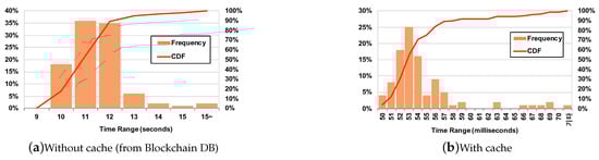 To give an idea of the impact of using cache, we measured the actual transaction update latency (which includes trust and reputation calculation) on our system with the dataset used in Section 4. Figure 7 plots the distribution of thos latency measurements with (Figure 7b) and without (Figure 7a) the local cache. The two figures may look similar, but note the units of x-axis; they are three orders of magnitude different (seconds vs. milliseconds). This shows how critical it is to use the cache when looking up data in the blockchain DB.