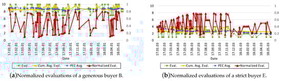 Figure 8a,b plots the rating values made over time by a generous and strict buyer, respectively, together with the corresponding NE, PEC average, and naive cumulative average of rating values. Two figures demonstrate the normalization process of the rating values according to each user’s grading tendency. When it comes to generous and strict users, even though raw rating values are extremely high or low, they become (almost) uniformly distributed into the range of 0 to 1 after the normalization process. On the other hand, naive cumulative average values remains either high or low, providing less meaningful information to other customers. Eventually, we can see that each user’s criteria is well reflected on the NE although every user has different tendency.