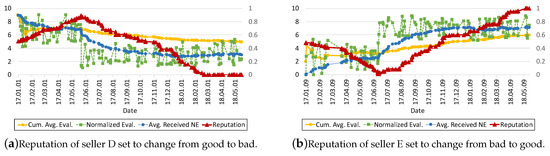 Figure 9a,b plot how the reputation of “bad to good” and “good to bad” sellers change over time, according to the evaluations they receive from counterparts. The seller’s reputation starts from a neutral value of 0.5 at the beginning. In Figure 9a, we observe that the reputation of seller D goes up to 0.9 approximately for six months and goes down drastically after 3 months losing all her reputation. However, naive cumulative average value does not follow that tendency well, and tends to lag behind due to large amount of out-dated history. On the other hand, seller E’s reputation shown in Figure 9b goes down for the first six months, and then goes up gradually after which it starts to receive good rating values. However, again, naive cumulative average value does not follow that tendency well, and tends to lag behind due to large amount of out-dated history. These two graphs show that the model derives reputation that better reflects the positive or negative grading aspect with respect to of an evaluator in comparison with .