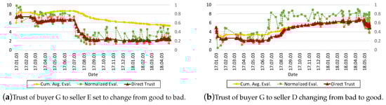 Figure 10a,b plot the change of trust of buyer G to seller E and to seller D, respectively. In Figure 10a, the buyer has a strong faith at the beginning, and the trust is going up and down slightly for the next six months. Afterwards, as the buyer loses confidence in the seller, her trust drops sharply to ∼0.2. On the other hand, Figure 10b shows the buyer’s trust increasing gradually from 0.2 to ∼0.6. However, for both cases, naive cumulative average value is lagging behind and does not follow the changes in rating promptly. According to these graphs, we can see that the notion “losing confidence is much easier than maintaining confidence” is well reflected, as expected.