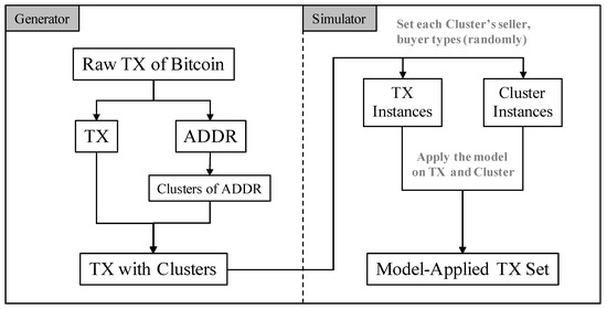 As depicted in Figure 11, we split the experimental set-up into two parts: the generator part and the simulator part. In the generator part, we extract and generate, from the raw transaction data of Bitcoin, meaningful data such as transaction amounts and addresses of users. BlockSci [35], an application for analyzing blockchain, is utilized for this purpose which supports three main features: parsing transactions, clustering addresses, and analyzing transactions. We first pass the raw block data into the parser to transform the data to the format used by BlockSci, which resulted in size reduction to 151GB without loss of original information.