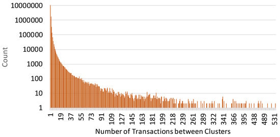 After clustering the addresses, we found that there are a lot of addresses which are used only once and never again, the so-called “single-hit” addresses. They are not included in any of the clusters due to lack of any usage pattern, and these were unsuitable for evaluating our model. Thus, we then examined which clusters of addresses have done transactions similar to the ones that could happen in real-life. We counted the number of transactions occurred between every pair of clusters, and plotted the distribution of transactions among addresses as in Figure 12. It shows that most of transactions between two clusters are concentrated in the range of 1 to 10, meaning a great deal of clusters consist of a single address and they are used for once or infrequently. To avoid the single-hit clusters which are not usually discoverable in the real-world, we searched for a range of transaction frequencies within Figure 12 that includes the least number of single-hit clusters. As a result, we selected 700 clusters which have each done transactions from 100 to 200 times, and extracted a list of 215,783 transactions that involve those clusters. From those transactions, there were total of 155,040 clusters including the selected clusters. Finally, the addresses within a cluster are substituted with their unique cluster identifying number.