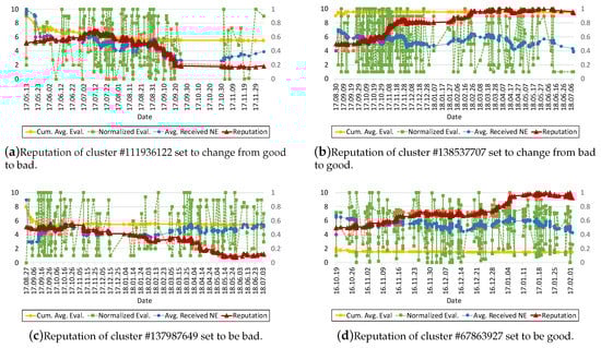 Analysis of Model-Applied TX Set: To analyze the result of applying our model to the transactions, we plot the reputation, , and of four representative clusters among 155,040 clusters as shown in Figure 13a–d.
