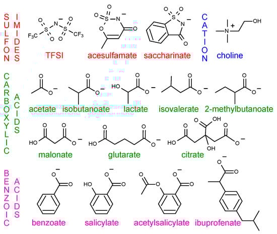 The choice of anions was made based on low toxicity and biodegradability of the corresponding ILs. We paired choline cation with fourteen biofriendly carboxylic acid, benzoic acid and sulfonimide-derived anions displayed in Figure 1. The harmful TFSI anion was included for comparison purpose and because choline TFSI is relatively well studied in the literature.
