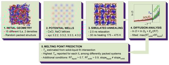 To the best of our knowledge, the crystal structure is known only for choline acetate, choline acesulfamate, choline saccharinate and choline TFSI among the studied ILs [,,,]. Thus, for each IL, we generated a solid phase using Coulombic potential wells inspired by the PSCP method [,]. The solid phases were then heated and their melting points were determined by the change in the self-diffusion coefficient of the ions. The developed method is summarized in Figure 2 and explained in detail in the following sections. An example workflow is also available online in Reference [].