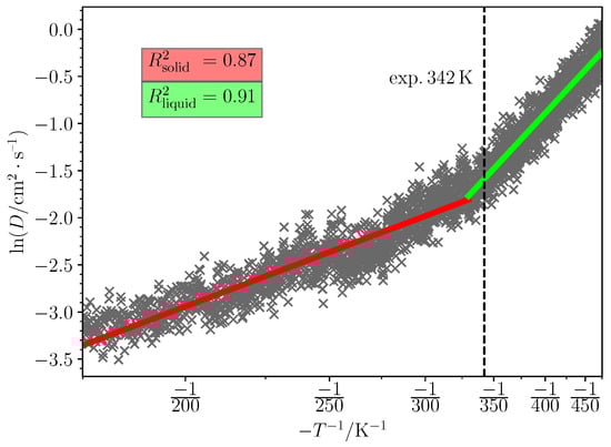 This phenomenon occurs most likely due to the presence of more than one competing diffusion mechanism. In this case, the D–T dependence cannot be properly linearized using the Arrhenius’ equation (Equation (1)), as different mechanisms may have different activation energies and pre-exponent factors .
