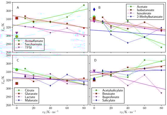 The predicted melting point () dependence on temperature rate () for: (A) choline sulfonimides, (B) choline carboxylates (with one carboxyl group), (C) choline carboxylates (with two carboxyl groups) and (D) choline benzoates. Large markers at correspond to experimental values. Solid regression lines extrapolate between different temperature rates.
