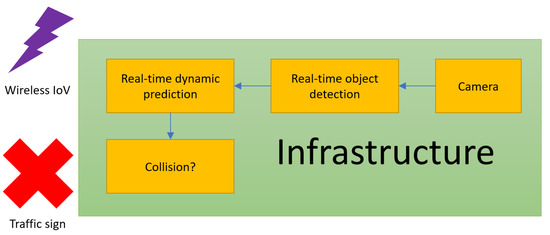 This paper is structured as follows. In Section 2, we give an overview of the IoV-based collision avoidance architecture proposed in [1], which can practically eliminate the assumption that all vehicles in the considered scenario should have communication ability. In Section 3, we start to introduce our idea, which also cooperates with YOLOv3. We will use our video recorded above a road to simulate the view that an infrastructure has been observed. Experimental results are shown and discussed in Section 4, and finally, Section 5 concludes the paper, where future work is also discussed.