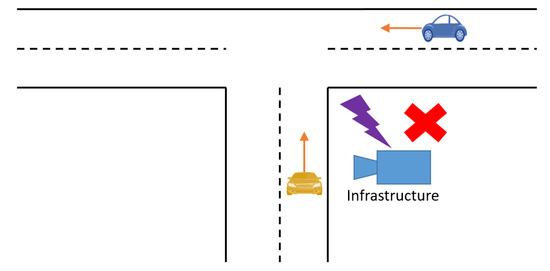 For instance, in Figure 2, there are two cars that come from distinct directions to the same intersection. If the collision happens, they will be alerted to slow down by the system via its communication ability and/or the traffic sign. Particularly, the vehicle with its communication ability can be warned by the IoV message and the roadside traffic sign. On the other hand, the vehicle without communication ability can be warned by the roadside traffic sign. It is practical to make up for the deficiency of the assumption that all vehicles must have communication ability.
