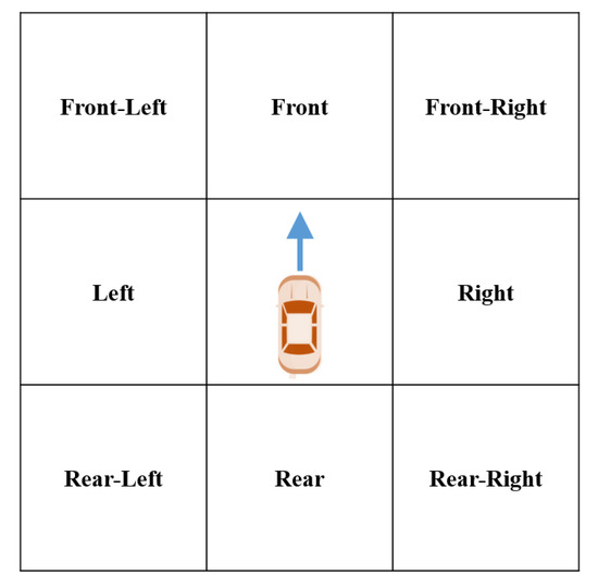 In this section, we will be introducing our predictive method. The main idea comes from vehicle dynamics [17,18,19]: the movement of a vehicle will not be a large value within a short time interval, such as the heading angle and the absolute position. Hence, if a video has a high resolution and FPS, we can estimate whether it is a reasonable position or not by calculating the difference between the two positions and using some skill of vehicle dynamics on the time axis to get the future confidence region. More specifically, the former means that if a vehicle is travelling at a higher speed, like the example shown in Figure 3, it is reasonable to estimate that its next position will not be at the left, rear-left, rear, rear-right, and right region. Conversely, if a vehicle just starts moving from a static situation, there are only two unreasonable regions—that is, left and right.