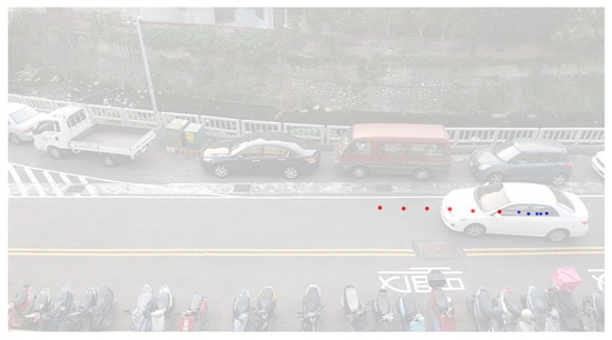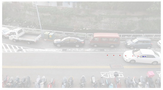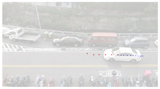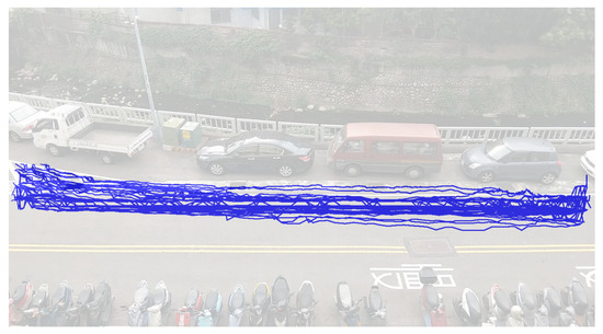 Figure 4 shows an image of the experimental scenario where vehicles enter from the right side and leave from left one. The blue points in Figure 4 represent the trajectory of a vehicle stored in our database, which is called the dynamic model. The database consists of 194 trajectories collected in the experimental scenario which compose the different dynamic models of our system. The database includes straight, parallel parking, as well as turning to the right and left trajectories. Thus, after acquiring the required information of a vehicle entering the road segment, the proposed method can find the most similar dynamic model from the database. Figure 5 shows 50 different trajectories of our dataset.