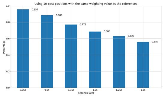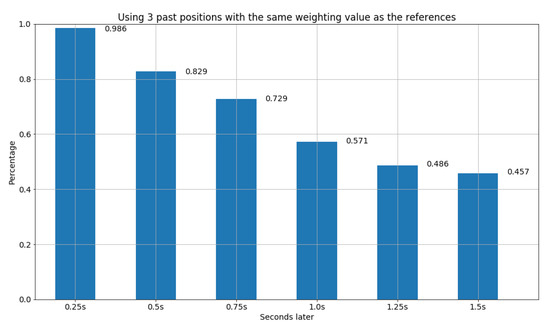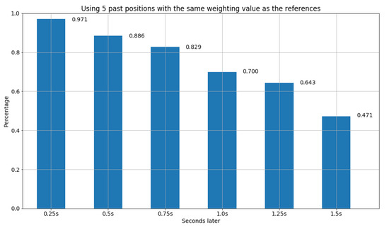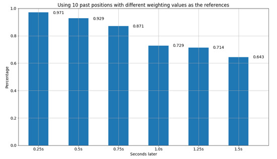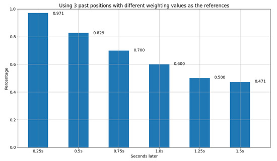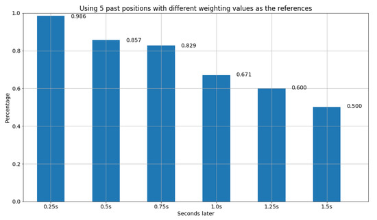 Furthermore, the second design of the find function also utilizes the concept of distance in Euclidean space for all past x frames to find the most similar model from the database, but with different weighting values, where x is set to 3, 5, and 10, respectively. In particular, the weighting value of frames is set to . Hence, for the setting of the past 3 frames as the references, we have the weighting value for the first past frame, for the second past frame, and for the third past frame. The results are shown in Figure 12, Figure 13 and Figure 14. We can observe that due to the design of different weighting values for distinct past frames, it can avoid the inclusion of obsolete and insufficient information. Thus, in Figure 14, we were able to obtain the best result among all the experiments, where the accuracy is more than 71 percent after 1.25 s, and 64 percent after 1.5 s.