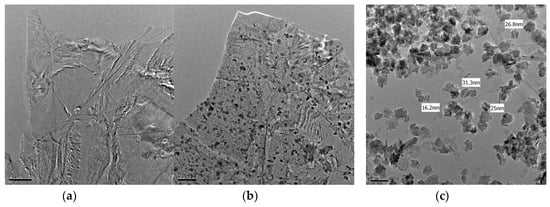 Transmission electron microscope (TEM) images of: (a) EG; (b) and (c) MONPs-EG composite at different magnifications.
