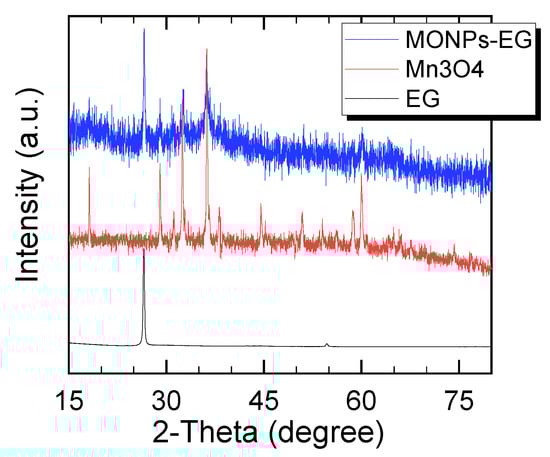Figure 3 presents XRD patterns of EG, Mn3O4 nanoparticles, and MONPs-EG samples. The XRD pattern of EG exhibited typical diffraction peaks of graphite carbon around 2θ = 26.5° and 54.5°, indicating the crystalline nature of the EG [40,41]. The MONPs-EG pattern revealed a relatively poor crystallinity in its structures compared to that of EG; the additional peaks at 2θ = 18.0°, 29.0°, 31.1°, 32.7°, 36.1°, 50.2°, and 60.0° are characteristic peaks of Mn3O4 (hausmannite), which can be observed from the XRD pattern of Mn3O4 nanoparticles.