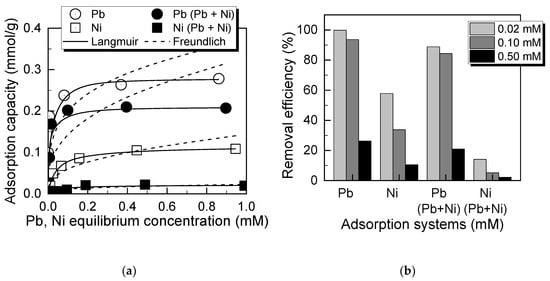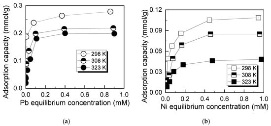 The prepared MONPs-EG exhibited much higher adsorption capacity for Pb2+ than for Ni2+. The maximum adsorption capacities at 298 K were calculated at 0.278 and 0.113 mmol/g for Pb2+ and Ni2+, respectively. There is evidence that the effectiveness of an adsorption process is dependent on the size of the ions in the solution; higher ionic radius (or lower hydrated radius) of heavy metals generally led to higher maximum adsorption capacity [42,43,44,45]. In this respect, because the ionic radius of Pb2+ (119 pm) is larger than that of Ni2+ (70 pm), higher adsorption capacity of MONPs-EG for Pb2+ can be anticipated (Table 3). In addition, higher molecular weight metals (such as Pb) can be removed more easily than lower weight ones (such as Ni) [43].