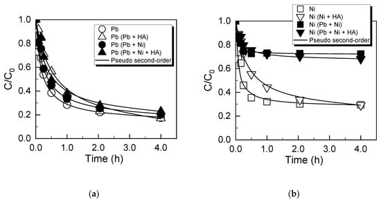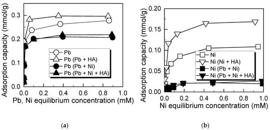 Humic acids (HA) are the major components of dissolved organic matter in natural surface water. They can have excellent binding characteristics and electrostatic interactions with metal ions in solution, leading to the formation of metal-organic complexes, which might affect the adsorption of metal ions on the prepared adsorbent [51,52,53]. The effect of HA on the adsorption behaviors of metal ions onto the prepared MONPs-EG in single and binary systems are shown in Figure 5 and Figure 7. It can be seen that the presence of HA in the systems reduced the adsorption rates of metals ions onto the MONPs-EG. This reduction is clearly observed for single metal systems, while it is indistinct in binary metal systems (Figure 5). However, with the supporting data shown in Table 4, the changes in the adsorption rates are noticeable in binary metal systems with the coexistence of HA. Indeed, wide variations in the pseudo-second order kinetic rate constants (k2) are observed in these systems, which are decreased from 24.37 to 16.73 and 4486.45 to 991.41 (g/mmol/h) for Pb2+ and Ni2+, respectively. Interestingly, despite the fact that the adsorption rate is hindered with the presence of HA, the adsorption capacity was promoted, especially in single systems (Figure 7). The maximum adsorption capacity of MONPs-EG for Pb2+ in single metal systems was 0.278 mmol/g at 298 K; this value increased to 0.298 mmol/g in the presence of 10 mg/L HA (Table 3). A similar trend was observed for Ni2+: the adsorption capacity increased from 0.113 to 0.174 mmol/g when HA coexists in the system. The presence of HA in binary metal systems can also promote the overall adsorption process, but increases in the adsorption capacities of MONPs-EG in these cases are insignificant, probably due to adsorption competition between metal ions, as discussed above. However, the results also verified the positive effect of HA coexistence in the systems on overall adsorption processes. The increase of metal ion adsorption capacities in the presence of HA might be due to the chelation of Pb2+ and Ni2+ with functional groups on HA, and adsorption of HA onto exposed carbon and manganese oxides structure on the MONPs-EG composite [53,54,55,56].
