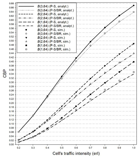 In Figure 1 and Figure 2, we consider the P-S and the P-S/BR models and present the simulation and analytical CBP of service-classes (3, 64), (2, 64), (1, 64) (Figure 1) and service-classes (3, 48), (2, 48), (1, 48) (Figure 2). Note that service-classes (3, 64), (2, 64) and (1, 64) have the highest requirement in terms of subcarriers (l = 64). Regarding the average channel gain we consider set 1 ( = 1/3 (k = 1, 2, 3)). In Figure 1, it is obvious that the BR policy decreases the CBP values of service-classes (3, 64), (2, 64) and (1, 64) compared to the corresponding CBP values of the P-S model. In Figure 2, the BR policy increases (in most of the cases) the CBP values of service-classes (3, 48), (2, 48), (1, 48) compared to the corresponding CBP values of the P-S model. A similar behavior appears in most of the service-classes whose calls have a requirement of less than 64 subcarriers. In addition, the same behavior (in terms of CBP) appears when we consider set 2 for the average channel gain.