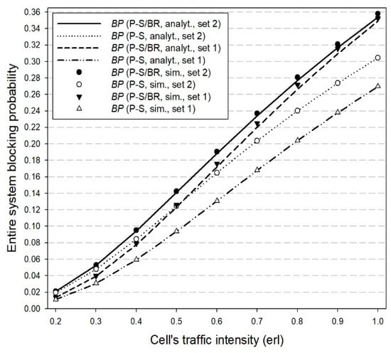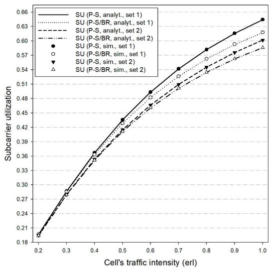 In Figure 3, we present the entire system BP for both sets of . We observe that the BP increases for both sets of when the BR policy is considered. This is because the values of parameters are chosen to increase the CBP of service-classes with low subcarrier requirements and benefit service-classes with high subcarrier requirements. The increase of BP in the case of the P-S/BR model results in a slight decrease of the SU and PU (for both sets of ) compared to the P-S model, as we show in Figure 4 and Figure 5, respectively. A similar behavior appears in the case of the corresponding quasi-random models.
