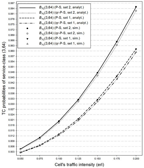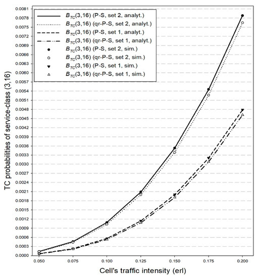 In Figure 6 and Figure 7, we consider the PS and the qr-P-S models for both sets of . Figure 6 and Figure 7 show the simulation and analytical TC probabilities of service-classes (3, 16) and (3, 64), respectively. We observe that: (1) in the qr-P-S model the TC probabilities are lower compared to those obtained in the P-S model, which is due to the quasi-random process which is smoother than the Poisson process, and (2) the selection of set 2 for the values of , increases the TC probabilities since the power assigned to calls in the case of set 2 is larger compared to set 1.