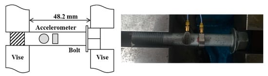 The bolt acts as a transmission path for vibration transfer from the nutrunner into the clamped parts. In the process of bolt fastening, the boundary stiffness and tensile force of the bolt increase. This tension in the bolt increases the natural frequency for flexural vibrations. The excitation of the bolt and its transfer to the clamped structure is inevitably generated by the nutrunner that fastens the bolt. While the vibration properties of the clamped structure are stationary and do not change, the frequency response of the bolts changes due to increasing preload. The vibration modal component continuously changes in a short fastening time and is an important indicator of the clamping force. To measure the modal properties, both ends of the bolt were fixed to a hydraulic vise. The thickness of the bolt was 10 mm. The grip length was 48.2 mm, which is the same for the load cell experiments shown in the following section. As shown in Figure 1, the accelerometers (PCB, 352A21/NC) were attached to the bolt surface. An impact hammer (PCB, 086C02) was used to excite the bolt. Two accelerometers were attached in the longitudinal and the transverse directions to confirm the occurrence of the signal in a similar band to the frequency component of the responses generated in the bolt fastening process. The actual responses during the clamping process and the impact-generated transverse flexural vibrations occurred in similar frequency bands.