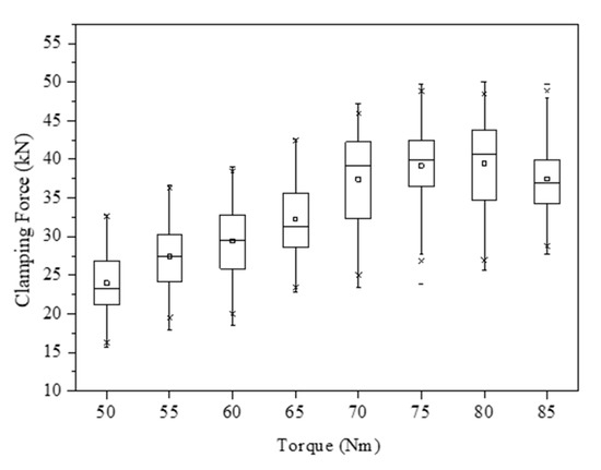 Torque and angle controls are used to apply uniform clamping forces to each bolt in the manufacturing process. Measurement of the tightening torque using a wrench is the least expensive and most efficient method for estimation of the clamping force [17]. When the torque is used to estimate the clamping force, the tightening is performed until the applied torque reaches the value set by the operator. Alternatively, the torque is estimated by the value measured when loosening the already tightened bolt. For the bolt assembly process, only a small portion of the fastening torque is converted to fastening force (less than 10%). Most of the applied energy is known to be used to overcome the friction generated on the bolt threads (40%) and on the bolt head or nut seat (50%). The efficiency of the conversion is affected by the bolt material, and can be changed by installing a lock washer or by lubricating the threads. Torque is converted into the product of nut factor, clamping force, and nominal diameter. Nut factor causes variation of 25–30% caused by friction, operator, geometry, tool accuracy, and relaxation factors. Consequently, it is difficult to use this for structures and joints that require precise monitoring of the clamping force [18,19,20]. The angle control method utilizes the linear relationship between the rotation and the clamping force in the elastic deformation of a bolt [21]. The status when the bolt head seat comes into contact with the bolted joint is called the snug point. At the snug point, the axial clamping force is zero; the fastening force increases in proportion to the angle in the rotating process [22].