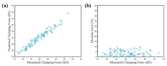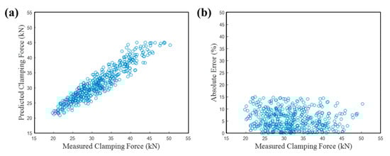 Scatter of clamping force estimated using accelerometer on nutrunner. (a) Estimated clamping force by vibration measurements and (b) relative deviations.