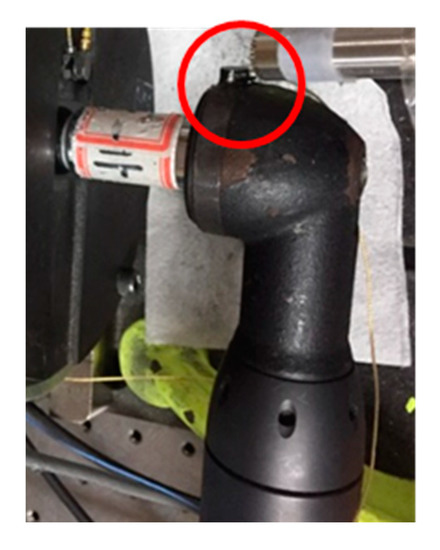 Vibration measurement with the accelerometer attached to the head of the nutrunner (red circle).