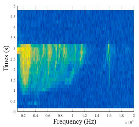 The frequency response of the measured bolts is shown in Figure 2. This figure shows the bolt vibration characteristics when excited by a point force. This provides important information about the modal properties of the testing bolt. When analyzed as the beams of simply supported boundary conditions with Young’s modulus of 207 GPa, density of 7600 kg/m3, and 10 mm diameter, the first natural frequency of the bolt was calculated as 8452 Hz according to the Euler–Bernoulli beam theory [44]. The value was similar to the measured value of 8388 Hz (an error of less than 1%). The resonance in the longitudinal direction was not observed.