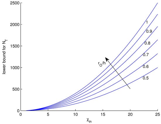 where . In Figure 2, the behavior of the lower bound of is reported as a function of the normalized dimension of the investigation domain, assumed square, for different values of the ratio . As can be seen, the number of required data quickly becomes unfeasible as the size of the investigated area increases.