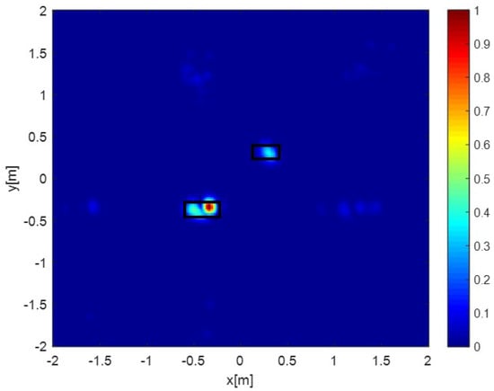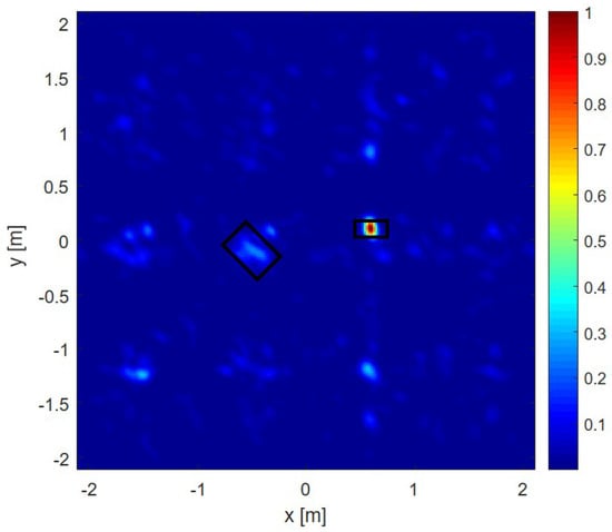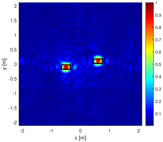 Normalized linear scale) single-frequency reconstruction of two metallic rectangular plates both located at the same depth of m. Full data (i.e., observations evenly taken in the plane) at GHz have been used and . Black solid line denotes actual plates’ shape and position.
